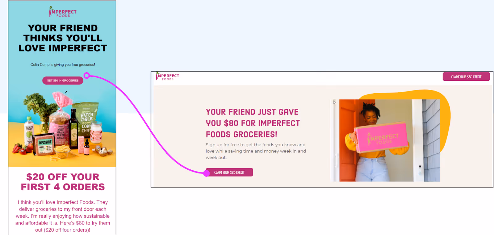You want Referred Friends to know exactly what’s being offered and how to take action, without any distractions. Imperfect Foods does a really good job of this. Below, the email on the left shows what a Referred Friend would receive from their Advocate Friend; the offer is clear and so is the CTA. When the Referred Friend clicks through, they arrive on the well designed landing page on the right that reinforces the offer and how to claim it - with no distractions.