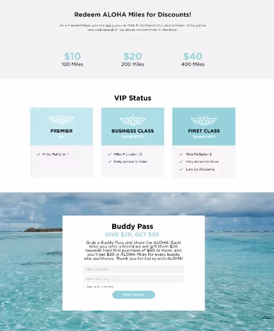 They branded their loyalty program as ALOHA Miles, they refer to loyalty program members as Frequent Flyers, and their tiers are Premier, Business Class, and First Class. Though all the fundamental earning events you expect in a loyalty program are there - 1 Mile per $1 spent, a birthday bonus, 20 miles for leaving a review - they’ve customized the experience in a way that customers feel like it’s fresh and different than most other loyalty programs that they’re incentivized to join.